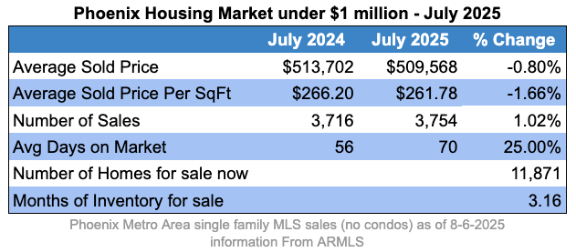 3,754 homes sold in Metro Phoenix in July. This is a 1.02% increase from July 2024.